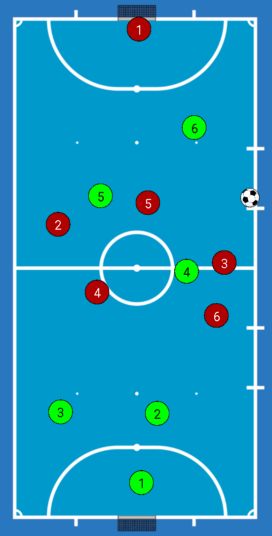El 6 rojo intenta cubrir y no llega, y es aquí donde empieza la mayor velocidad de pases, ya que el 4 verde debe hacer el pase de primera al 5 verde , para no darle tiempo al 3 rojo que marque.